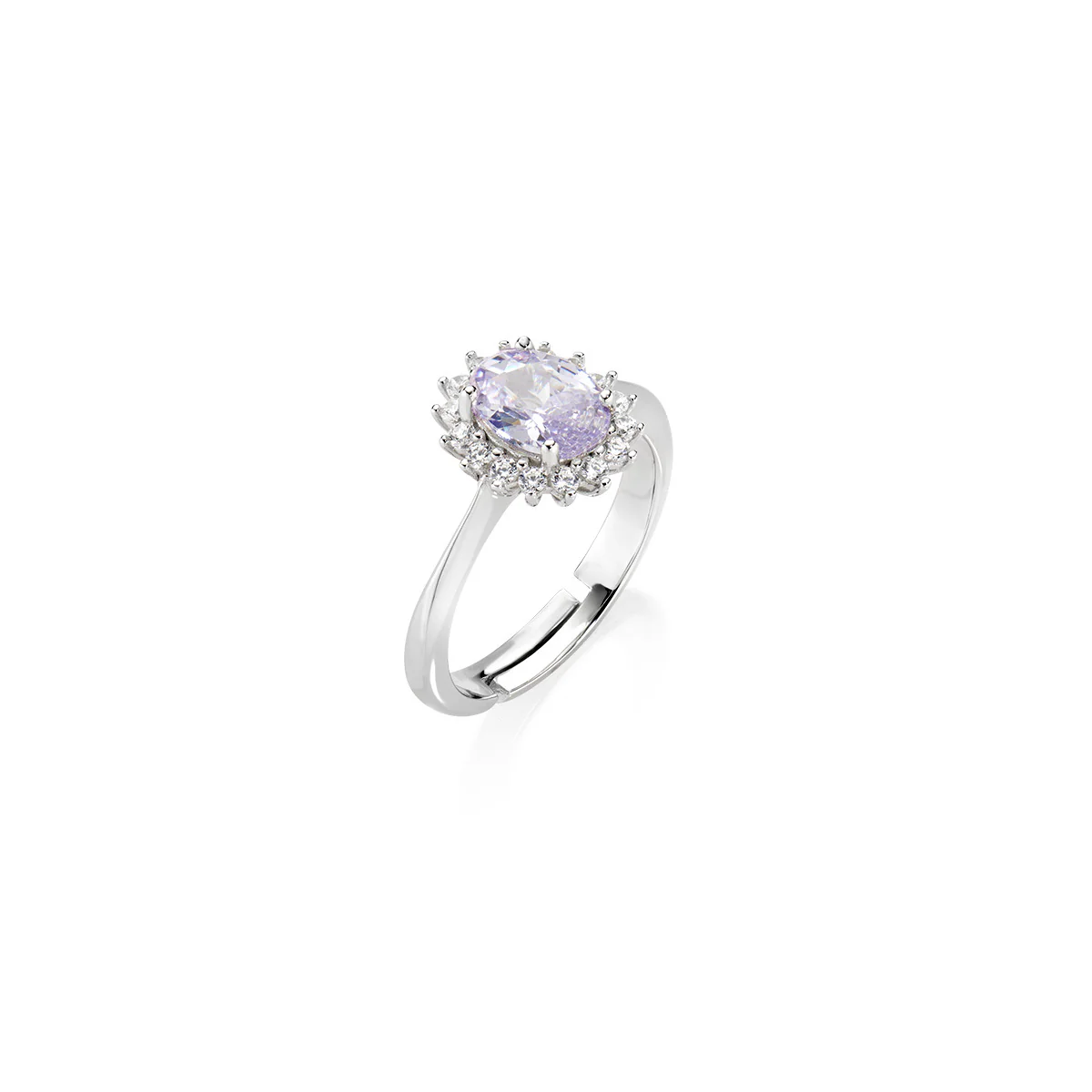 Anello regolabile in argento 925 rodiato. Modello kate con zircone lilla ovale di 8 x 6 mm al centro e corona di zirconi bianchi. Disponibile in due misure che coprono le taglie dalla 10 alla 14 e dalla 16 alla 20.