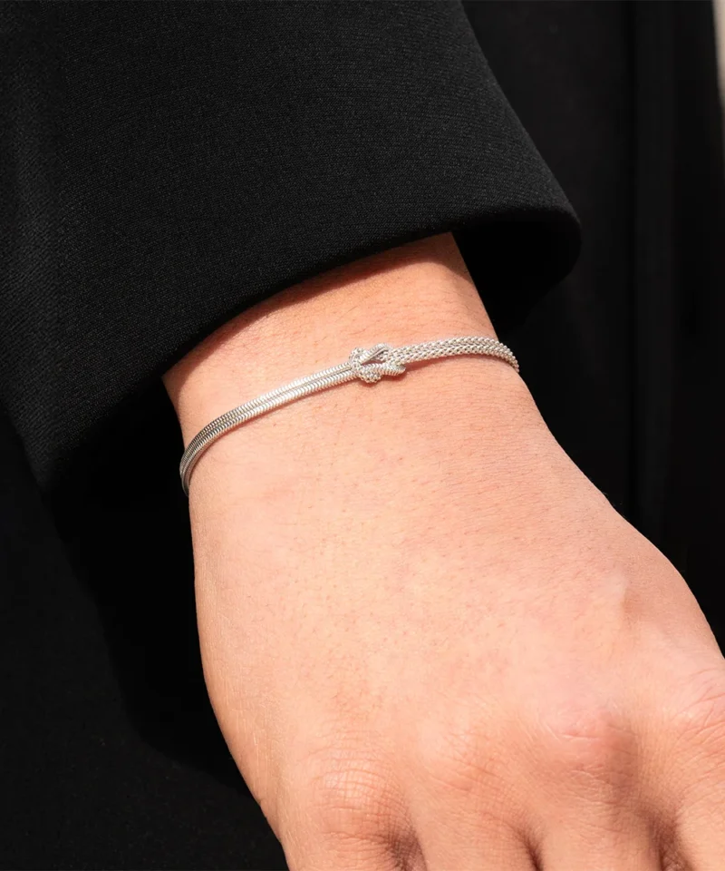 Bracciale in argento 925 dorato con due catene unite a formare un nodo centrale. Il Bracciale Nodo d’Amore è il simbolo tangibile di ogni legame indissolubile. Celebra l’intreccio unico con la tua persona del cuore e racconta il sentimento che vi unisce.
