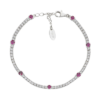 Bracciale tennis in argento 925 rodiato con zirconi bianchi da 2 mm intervallati da zirconi verdi da 3 mm. Lunghezza regolabile da 16 a 19 cm con catenina di allungo e chiusura a moschettone.
