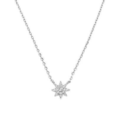 Collana in argento 925 rodiato con piccolo charm da 8 mm a forma di stella a 8 punte e pavé di zirconi bianchi. Lunghezza regolabile da 40 a 45 cm con catenina di allungo e chiusura a moschettone.