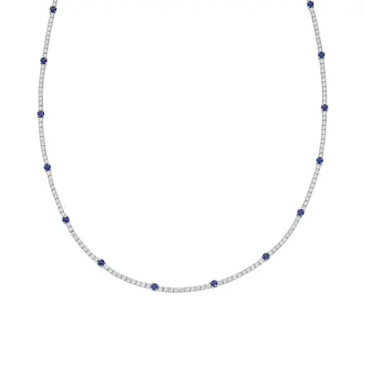 Collana tennis in argento 925 rodiato con zirconi bianchi da 2 mm intervallati da zirconi blu da 3 mm. Lunghezza regolabile da 35 a 40 cm con catenina di allungo e chiusura a moschettone.