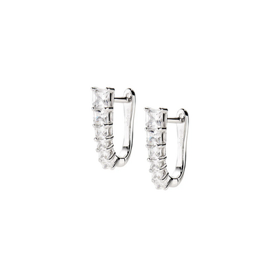 Orecchini huggies ovali in argento 925 rodiato, modello rivière con zirconi quadrati bianchi da 2 a 3 mm. Lunghezza totale: 1.4 cm